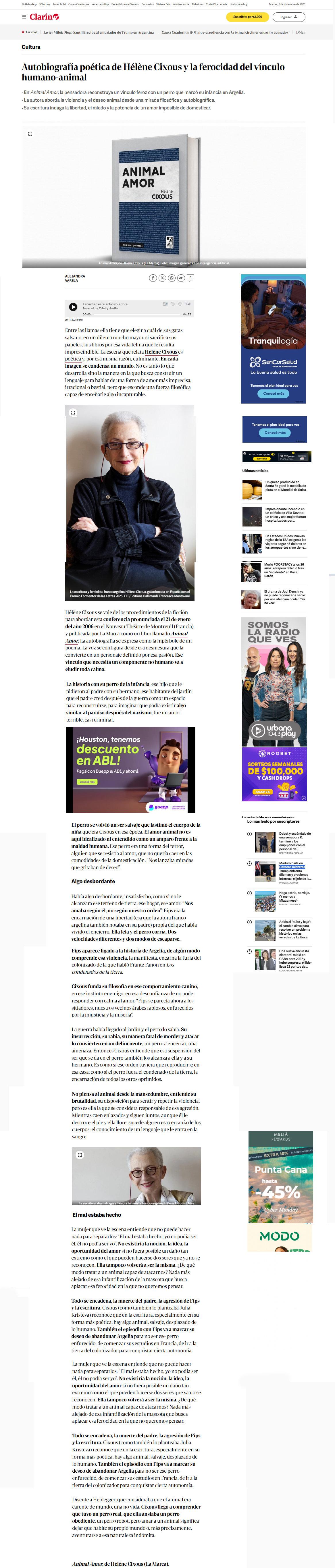 El perro se volvió un ser salvaje que lastimó el cuerpo de la niña que era Cixous en esa época. El amor animal no es aquí idealizado ni entendido como un amparo frente a la maldad humana. Ese perro era una forma del terror, alguien que se resistía al amor, que no quería caer en las comodidades de la domesticación: “Nos lanzaba miradas que gritaban de deseo”.