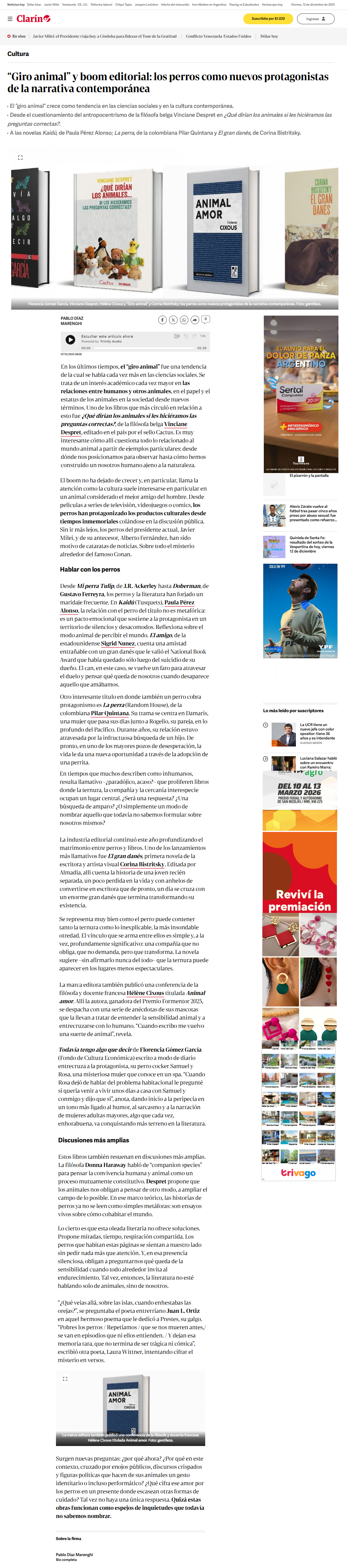 Desde Mi perra Tulip, de J.R. Ackerley hasta Doberman, de Gustavo Ferreyra, los perros y la literatura han forjado un maridaje frecuente. En Kaidú (Tusquets), Paula Pérez Alonso, la relación con el perro del título no es metafórica: es un pacto emocional que sostiene a la protagonista en un territorio de silencios y desacomodos. Reflexiona sobre el modo animal de percibir el mundo. El amigo, de la estadounidense Sigrid Nunez, cuenta una amistad entrañable con un gran danés que le valió el National Book Award que había quedado sólo luego del suicidio de su dueño. El can, en este caso, se vuelve un faro para atravesar el duelo y pensar qué queda de nosotros cuando desaparece aquello que amábamos.