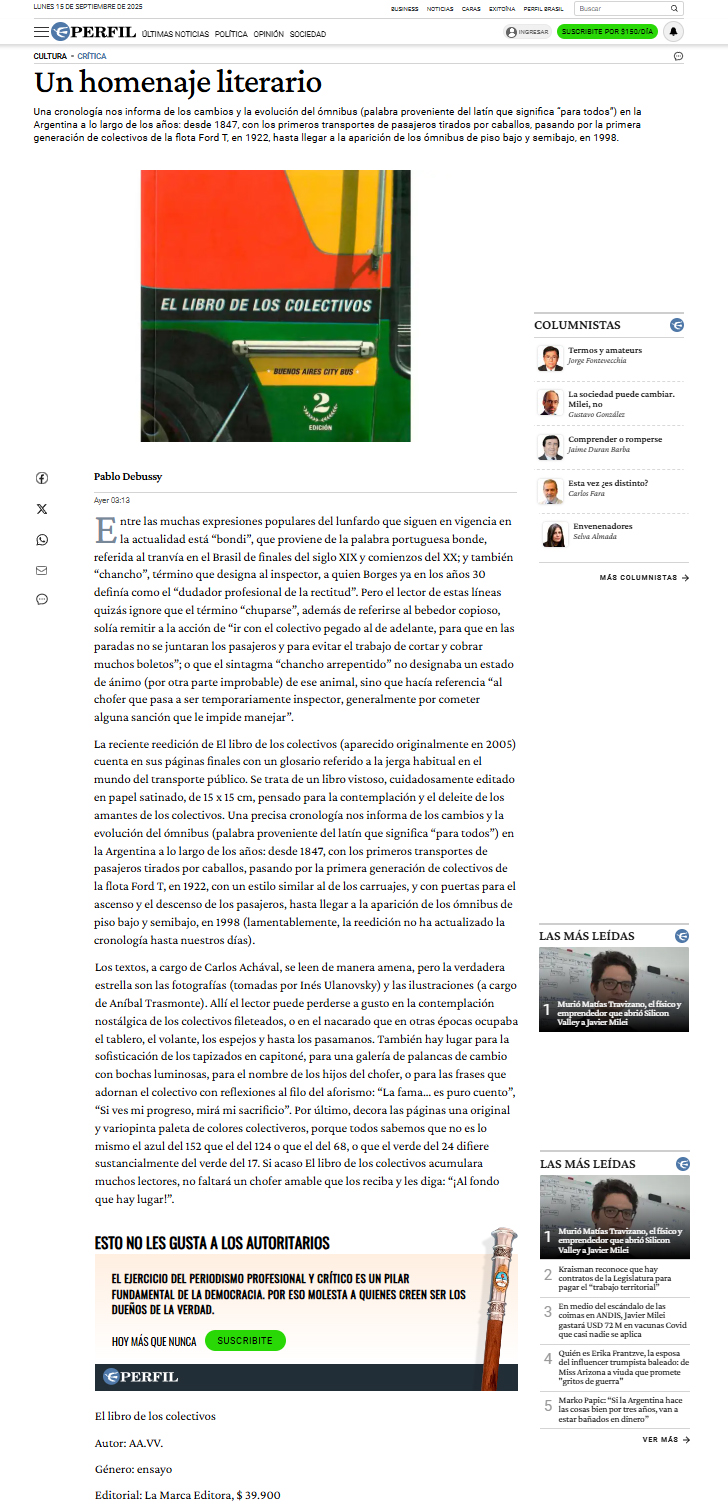 Los textos, a cargo de Carlos Achával, se leen de manera amena, pero la verdadera estrella son las fotografías (tomadas por Inés Ulanovsky) y las ilustraciones (a cargo de Aníbal Trasmonte). Allí el lector puede perderse a gusto en la contemplación nostálgica de los colectivos fileteados, o en el nacarado que en otras épocas ocupaba el tablero, el volante, los espejos y hasta los pasamanos. También hay lugar para la sofisticación de los tapizados en capitoné, para una galería de palancas de cambio con bochas luminosas, para el nombre de los hijos del chofer, o para las frases que adornan el colectivo con reflexiones al filo del aforismo: “La fama… es puro cuento”, “Si ves mi progreso, mirá mi sacrificio”. Por último, decora las páginas una original y variopinta paleta de colores colectiveros, porque todos sabemos que no es lo mismo el azul del 152 que el del 124 o que el del 68, o que el verde del 24 difiere sustancialmente del verde del 17. Si acaso El libro de los colectivos acumulara muchos lectores, no faltará un chofer amable que los reciba y les diga: “¡Al fondo que hay lugar!”.